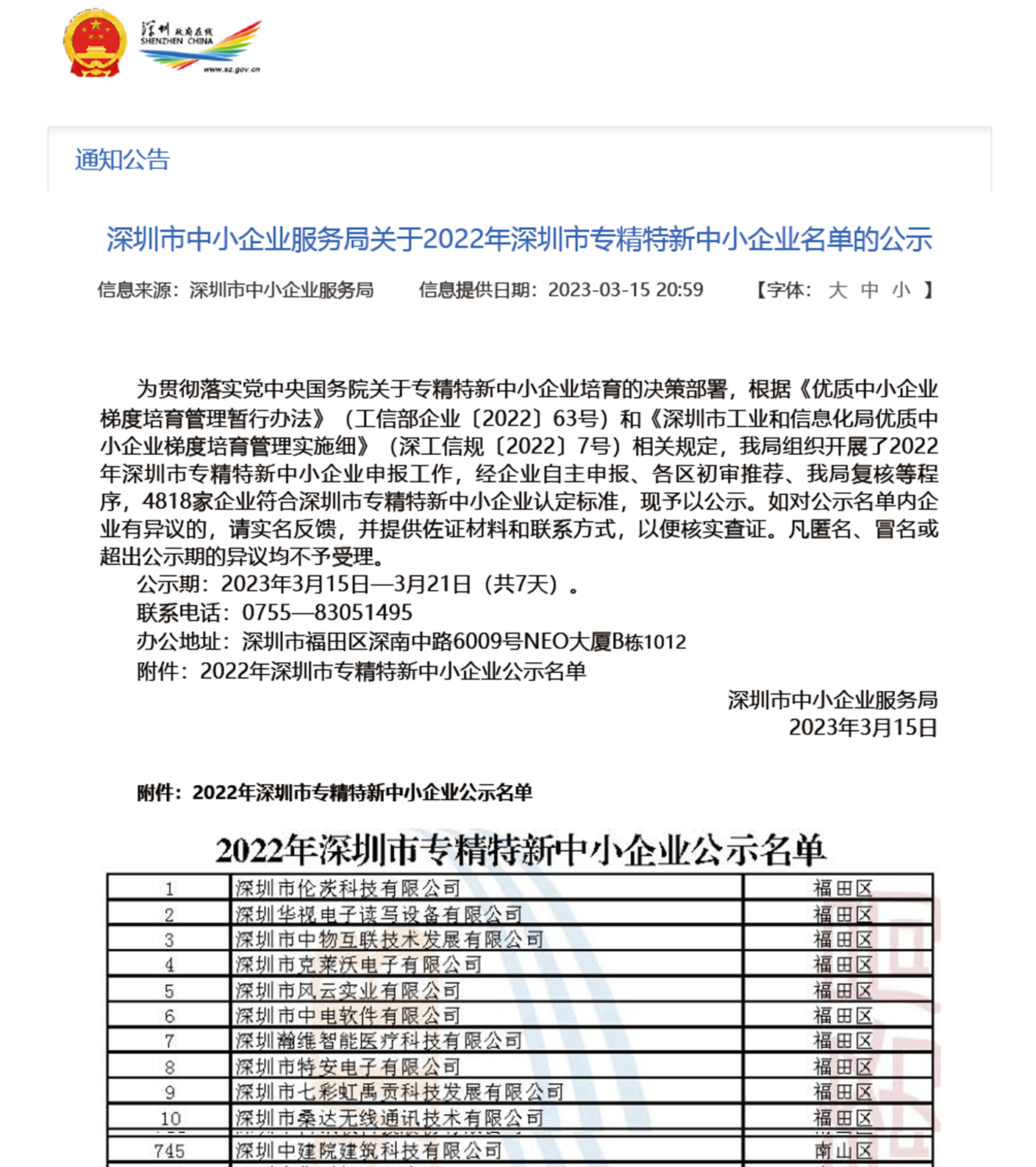 3月15日-21日,深圳市中小企業(yè)服務(wù)局對2022年深圳市專精特新中小企業(yè)名單進(jìn)行公示,深圳中建院建筑科技有限公司(簡稱“深圳中建院”)獲得深圳市專精特新中小企業(yè)認(rèn)定。