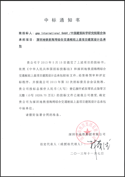 近日,我院與德國(guó)GMP國(guó)際建筑設(shè)計(jì)公司組成的設(shè)計(jì)聯(lián)合體收到了深圳市地鐵集團(tuán)有限公司發(fā)來(lái)的關(guān)于深圳地鐵前海灣綜合交通樞紐上蓋項(xiàng)目建筑設(shè)計(jì)總承包的中標(biāo)通知書(shū)。
