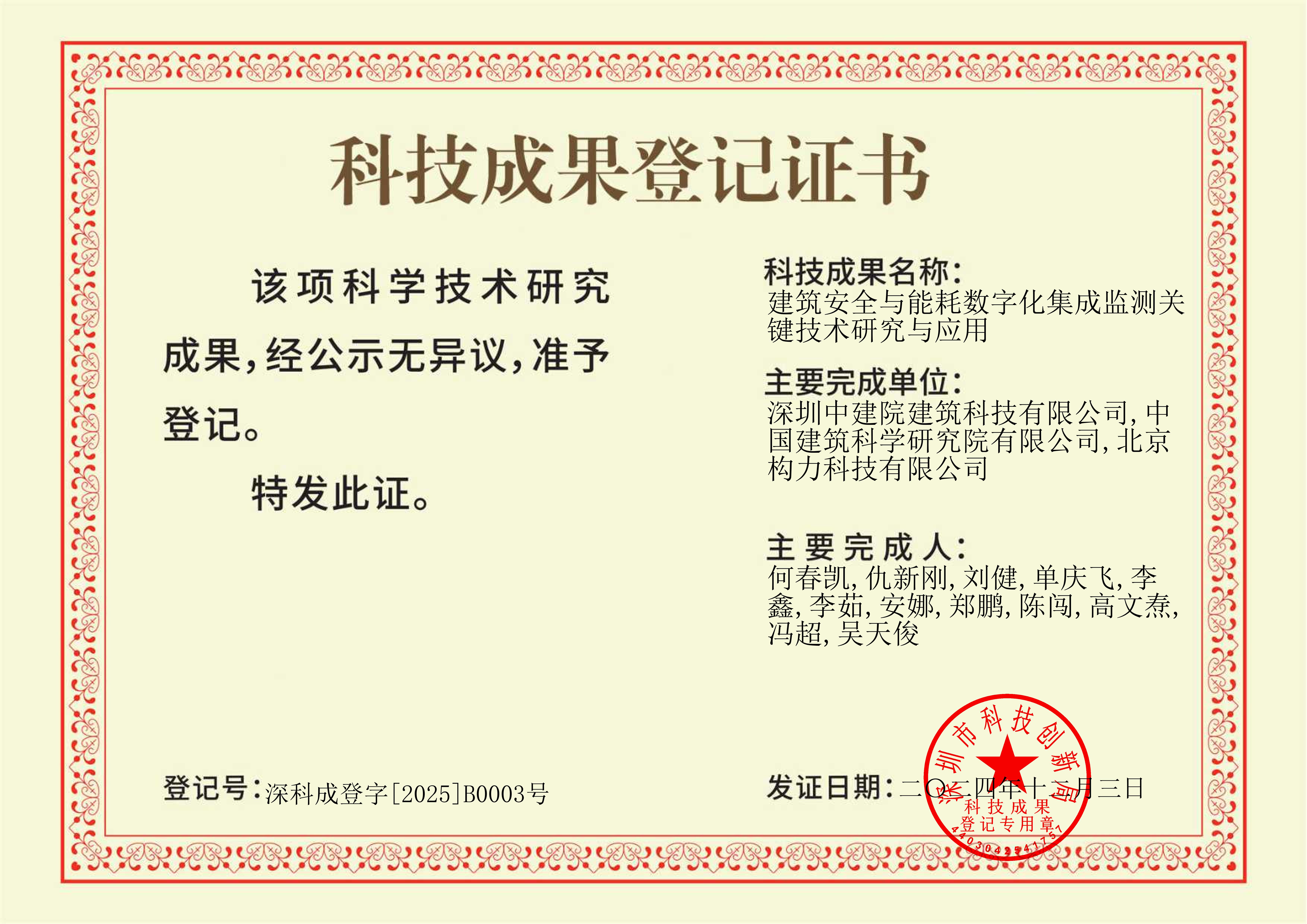 ??2025年1月20日,國家建筑工程技術研究中心發布15項創新成果,中國建研院深圳分公司并國家建筑工程技術研究中心灣區研究院(以下簡稱“灣區研究院”)的科技成果“建筑安全與能耗數字化集成監測關鍵技術”成功入選。