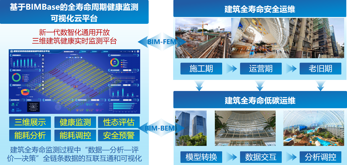 ??“建筑安全與能耗數字化集成監測關鍵技術”科技成果針對現階段建筑安全及能耗整體綜合性能狀態的分析、理解、預警難度大,結構安全與建筑能耗運維效率低下,海量建筑數字信息安全可控能力差的突出問題,面向我國“數字住建”建設發展目標,積極響應數字化轉型背景下建筑全壽命周期內健康與綠色運維的重大需求,搭建了基于國產自主知識產權BIMBase的建筑全壽命周期健康監測可視化云平臺,提出了建筑圍護結構與主體結構關聯性分析與一體化監測技術,開發了建筑在實際運行邊界條件下的最優能效仿真平臺,研制了基于BIMBase平臺的建筑信息模型到建筑能耗模型的高效轉換工具,形成了建筑安全與能耗數字化集成監測成套關鍵技術體系,增強了專業領域核心競爭力。
